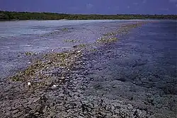 | Tridacna Islet | 91,000 m2 | The southernmost of the Windward Islets, Tridacna was named for the nearby coral reef and its dense population of giant clams (Tridacna maxima). Tornefortia-Morinda scrub cover 88% of the islets, which is particularly scarce in Pisonia. Patches of Lepturus reflect earlier clearing of the islet, which is also a major breeding ground for the sooty tern. | ![]() The lagoon reef of Tridacna Islet with an extensive clam population. | |