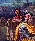 According to Hungarian legend, one of the numerous children of Attila was named Csaba. He is described as a skilled warrior and general in Hungarian chronicles who led his people to many victories. In the Hungarian chronicles, he is regarded as the ancestor of the Aba clan. According to Hungarian chronicles and tradition, also Árpád was a descendant of Attila, though it is unclear whether he descended from him through Csaba or another of his children. Hungarian chronicles also claim that the Magyars and the Huns descend from two brothers, Hunor and Magor, and their respective wives, the daughters of Dula, or Dulo.[3][4] Attila's younger son, Ernak is a namesake of a member of the so-called Dulo clan, the first ruler of the Bulgars according to the Nominalia of the Bulgarian khans, living in the days of Attila. The person mentioned in the Nominalia is considered to be Ernak himself, or at least of Attilid descent.[5][6]