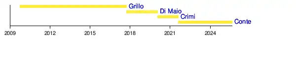The leader of the Five Star Movement[1] is the de facto and/or de jure leader and guide of the M5S, a political party in Italy, founded in October 2009 by Beppe Grillo and Gianroberto Casaleggio.