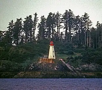 Barkley Sound | Barkley Sound, northern entrance | Ucluelet, southern end | 1915 | The building is white with a red lantern. It flashes every 12 seconds and has a focal plane of 15 metres (50 ft). The original structure was destroyed by a tsunami in 1914 and rebuilt in 1915. |