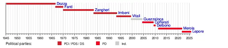 | Mayor of Bologna | Term start | Term end | Party | Coalition | Election | |||