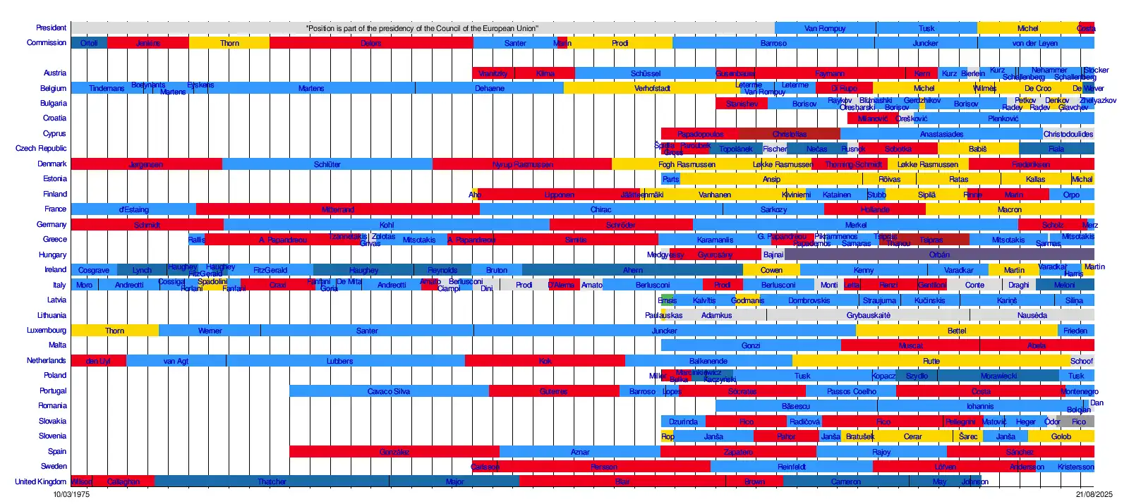 EPP – PO | 13 December 2023 | 13 years, 195 days[e] | 2023 | 2027 | 8.45% | Between January and June 2025, Donald Tusk is the head of government of the rotating presidency of the Council of the European Union. | |