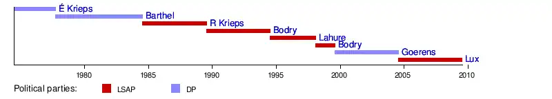 | Robert Krieps | LSAP | 20 July 1984 | 14 July 1989 | Jacques Santer | ||