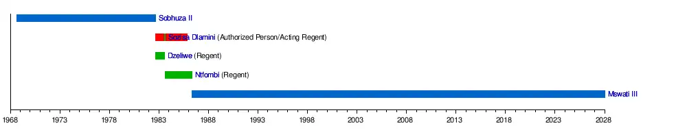 - Queen Ntfombi: 18 August 1983 – 25 April 1986