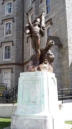 | L'Ecole Polytechnique Monument | 1919 | Donated by the students of the French Military Academy to the Corps of Cadets in 1919. The monument currently stands in the cadet Central Area away from general public access. The statue is a replica of a monument to French cadets who took part in the defense of France in 1814. First-year cadets are required to know the four "mistakes on the French Monument": curved saber but straight scabbard; flag blowing one direction, coat tails the other; button unbuttoned; and cannonballs too large for bore of the cannon. | [12] | |