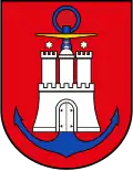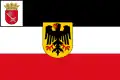 28 May 1947 | The red-white-red flag with the coat of arms. The ship represents the Hanseatic League while its sails represents the Hanseatic cities (the red-white horizontal sail with the red cross and the key represents Bremerhaven, the blue sail with a gold anchor represents Geestemünde and the red sail with two scythe blades represents Lehe). Both the ship and fish represents the municipality as a port city. Designed by Waldemar Mallek.[1] |