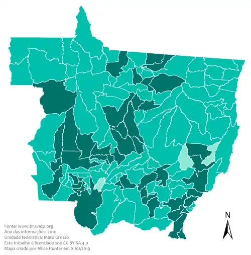 According to the list. of the 141 municipalities in the state of Mato Grosso, none of them have very high HDI (equal to or greater than 0.800), 49 have high HDI (between 0.700 and 0.799), 89 have medium (between 0.600 and 0.699), 3 have low (between 0.500 and 0.599), and none of them have a very low (less than 0.500). The HDI of the state of Mato Grosso is 0.774 (considered high).[5]