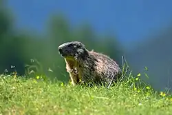 The Swiss National Park is home to several large animals. Visitors of the park will often hear and see alpine marmots. These may even be observed from very close up in one of the many designated resting places within the park. Other large animals include ibex, red deer, chamois, red fox, golden eagles and many more. Occasionally wolves and brown bears are also observed in the park but only rarely and these animals do not permanently reside in the park any more.[9]