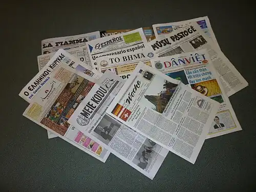 This is a list of newspapers published in New South Wales , Australia, in Languages other than English (LOTE). It reflects the many people who have migrated to this part of the world. According to the 2011 Census, 22.5% of the population speak a language other than English at home and 31.4% of the population were born overseas.[ 1] More than 160 languages, as well as English, are spoken at home in Australia.