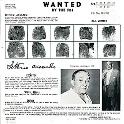 In 1955, Accardi was arrested on a federal narcotics charge in Newark, New Jersey. After posting a $92,000 bond, Accardi skipped bail and fled to Turin, Italy, where he continued smuggling heroin into the U.S. and Canada.[11] Accardi later moved to Toronto, Canada, to oversee this operation. In 1960, U.S. authorities finally located Accardi in Turin, Italy and on November 28, 1963, after a long legal fight, Accardi was extradited back to New York.[11] On July 21, 1964, Accardi was convicted on narcotics conspiracy and skipping bail. On August 24, he was sentenced to fifteen years of imprisonment and a $16,000 fine.[12] He died on December 3, 1977.