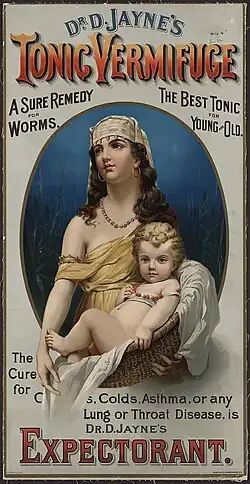 - Vermifuge: before modern sanitation practices, intestinal parasite infections were common; a variety of worm lozenges, powders, and syrups, commonly including santonin, were sold as treatment.[37][38][39]