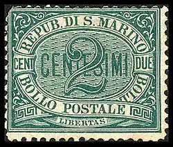 When postage stamps were introduced in the mid-19th century, San Marino signed a postal treaty with Italy to use Italian stamps for its mail.[1] On March 2, 1877, a new agreement was signed between the two countries that enabled San Marino to issue its own stamps.[2]