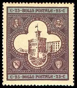 The first San Marino postage stamps were a definitive stamps consisting of two designs covering seven denominations.[3] The stamps, which depicted the coat of arms of the republic with the Three Towers of San Marino at Monte Titano (except the 2-centesimi stamp), were created by the design firm Fratelli Pellas in Genoa and printed on Italian watermarked paper by the Officina Carta e Valori in Turin.[2] The first Commemorative stamps were introduced in 1894.[2]