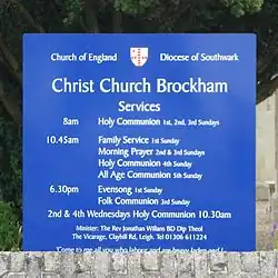 Administratively, Mole Valley district is split between two Church of England dioceses: the Anglican Diocese of Southwark, the seat of which is Southwark Cathedral in London,[50] and the Diocese of Guildford, whose cathedral is at Guildford in Surrey.[51] The Diocese of Southwark's Reigate Deanery, part of the Reigate Archdeaconry and the Croydon Episcopal Area,[52] administers the churches at Betchworth, Brockham Green, Buckland, Charlwood and Leigh.[53][54] The churches in Guildford Diocese are covered by three deaneries—Dorking, Epsom and Leatherhead—all of which are in turn part of the Archdeaconry of Dorking.[55] The churches at Abinger Common, Capel, Coldharbour, Dorking (St Martin and St Paul), Forest Green, Newdigate, North Holmwood, Oakwood Hill,[note 3] Ockley, Pixham, Ranmore Common, South Holmwood, Westcott and Wotton are in Dorking Deanery; Box Hill and Headley are covered by Epsom Deanery; and Leatherhead Deanery administers Ashtead's two churches (St George and St Giles), the two in Leatherhead (St Mary and St Nicholas and All Saints) and those at Fetcham, Great Bookham, Little Bookham, Mickleham and Westhumble.[55]