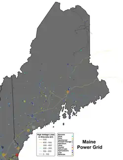 This is a list of electricity-generating power stations in the U.S. state of Maine, sorted by type and name. In 2023, Maine had a total summer capacity of 5,252 MW through all of its power plants, and a net generation of 12,512 GWh.[2] In 2024, the electrical energy generation mix was 30.4% natural gas, 27.5% hydroelectric, 20.6% wind, 11% biomass, 7.8% solar, 0.4% petroleum, 0.2% coal, and 2.1% other. Small-scale solar, which includes customer-owned photovoltaic panels, delivered an additional net 1,015 GWh of energy to the state's electrical grid in 2024. This was nearly equal to the 1,077 GWh generated by Maine's utility-scale photovoltaic plants.[1]