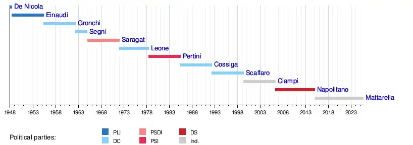 The president of Italy (Italian: Presidente della Repubblica) is the head of state of the Italian Republic. Since 1948, there have been 12 presidents of Italy.