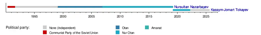 The president of Kazakhstan holds the highest authority in the Republic of Kazakhstan. Established under the Constitution of Kazakhstan, the president is the head of state and is directly elected by the people for a nonrenewable term of seven years. Alongside the prime minister, the president leads the executive branch of the Kazakh government and serves as the commander-in-chief of the Kazakh Armed Forces.[1] Since the establishment of the office of the presidency on 24 April 1990, under the Kazakh Soviet Socialist Republic, Kazakhstan has had only two individuals serve as president.[2] The current president, Kassym-Jomart Tokayev, assumed office on 20 March 2019, following the resignation of Nursultan Nazarbayev, the country's founding president.[3]