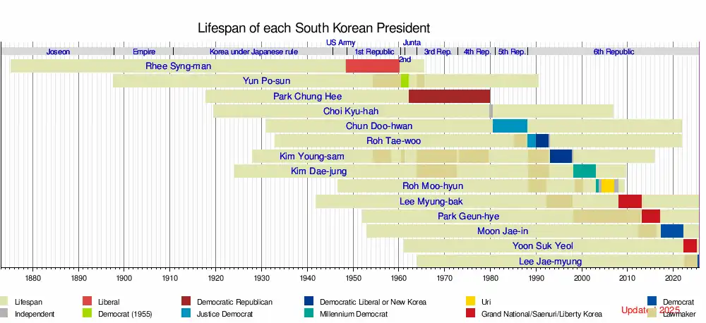 This is a graphical lifespan timeline of presidents of South Korea as well as their terms in the National Assembly. The presidents are listed in order of office.
