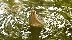 Douala Edéa National Park is located in the Littoral Region of Cameroon, on either side of the mouth of the Sanaga River on the shore of the Bight of Biafra, opposite the island of Bioko.[20] The reserve was established in 1932. As of 2000, it covered 160,000 hectares (400,000 acres).[21] Cameroon designated the reserve as a wildlife park for scientific purposes in 1971, Lake Tissongo, a lagoon connected to the south bank of the Sanaga river by a 5 kilometres (3.1 mi) tidal channel, is included in the park.[22] 80% of the reserve is covered by tropical lowland equatorial forest, and 15% by Atlantic mangrove forests. Fauna include forest elephants, primates (chimpanzees, monkey species such as black colobus), antelopes (sitatunga, blue duiker, etc.), West African manatees, sea turtles, dolphins, crocodiles, alligator, many fish species, terrestrial and water bird species.[23] The red-capped mangabey was reported to be common in the reserve in 1972.[24] The endangered red-eared nose-spotted guenon was reported in the Lombé part of the park in densities of 2-3 groups per square kilometers, but populations had dropped elsewhere due to hunting.