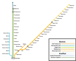 The first railway line in the region opened on 14 April 1874 between Wellington and Lower Hutt.[3] Over the next two decades, two main railway lines were constructed from Wellington; the Wellington and Manawatu Railway, running north along the west coast through Porirua and the Kāpiti Coast, and the Wairarapa Line along the Hutt and Wairarapa valleys. The W&MR was later incorporated into the North Island Main Trunk route between Auckland and Wellington. These lines have both been rerouted substantially since, with the Johnsonville Branch and the Melling Branch being former alignments of these lines respectively.[4][5] The present network takes a radial form centred on Wellington, with 49 stations in total.