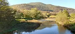 The Aegean Sea catchment basin drains the Thracian Plain and most of the higher lands to the south and southwest. Several major rivers flow directly to the Aegean Sea. Many of their tributaries fall swiftly from the mountains and have cut deep, scenic gorges. The 480 km–long Maritsa (of them 321 km in Bulgaria) and its tributaries drain all of the western Thracian Plain, most of Sredna Gora, the southern slopes of the Balkan Mountains, and the northern slopes of the eastern Rhodopes. After it leaves Bulgaria, the Maritsa forms most of the Greco-Turkish border.[4] Maritsa's major tributaries are the Tundzha, Arda, Topolnitsa, Vacha, Stryama, etc. The other Bulgarian rivers flowing directly to the Aegean are the Struma and the Mesta.[3][4]
