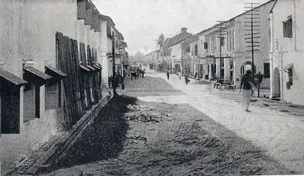 Plots of land had been sold to the Chinese by the local land-owning aristocrat, the Dato Panglima Kinta, Mohamed Jusuf, who had laid them out with broad, straight streets but the rapid development had been disorderly so that the main road to Gopeng varied in width from 20 to 70 feet. There was then a great fire on 1 June 1892, which destroyed much of the town's wooden buildings which had attap palm thatch roofs. The reconstruction of the town was organised by the British Collector of Land Revenue, W.J.P. Hume, who straightened the road network, redrew the land boundaries and issued new title deeds. He had no formal authority to do so but his influence and good sense made a success of the scheme. The streets were now 50–60 feet wide, brick drains were laid and shade trees planted.[2]