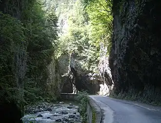 Trigrad Gorge is a canyon of vertical marble rocks in the western Rhodope Mountains. It is located at 1.2 km from the village of Trigrad, Smolyan Province. The gorge is 7 km long and follows the course of the Trigrad River, which plunges into the Devil's Throat Cave and 530 m further emerges as a large karst spring. The gorge's walls reach a height of up to 200 m. There are around 150 in the vicinity of the gorge which are important sanctuaries for bats. It was declared a natural landmark in 1963. The gorge is included in the 100 Tourist Sites of Bulgaria under No. 88.[21][22] | ![]() |