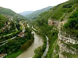 Iskar Gorge is Bulgaria's longest and largest gorge with a total length of 67 km along the valley of Iskar River. The gorge passes through the Balkan Mountains and is situated between the town of Novi Iskar in Sofia City Province and the village of Lyutibrod in Vratsa Province. Along the densely wooded gorge are located a number of rock formations, caves and waterfalls, as well as monasteries and villa zones.[10] | ![]() |