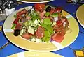 Middle East[22] | Vegetable salad | Chopped salad of finely diced tomato and cucumber. Usually made of tomatoes, cucumbers, onions and parsley, and dressed with fresh lemon juice, olive oil and black pepper. Generally, the cucumbers are not peeled. The key is using very fresh vegetables and chopping them as finely as possible.[23] |