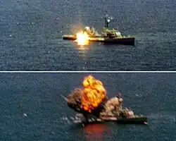 | Raffaello | Iran–Iraq War: The barracks ship, a former ocean liner, was hit by AM-39 Exocet missiles from an Iraqi Super Frelon helicopter or missile boats. The ship burned and was later scuttled.[16][51] |