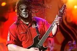 Slipknot is an American heavy metal band from Des Moines, Iowa. The band was founded in 1995 by vocalist Anders Colsefni, guitarists Donnie Steele and Josh Brainard, bassist Paul Gray, drummer Joey Jordison and percussionist Shawn "Clown" Crahan, who released the group's first demo Mate. Feed. Kill. Repeat. in 1996.[1] After its release, the band went through a number of lineup changes, replacing Colsefni with Corey Taylor, Steele with Mick Thomson and Brainard with Jim Root, as well as adding second percussionist Chris Fehn, turntablist Sid Wilson and sampler Craig "133" Jones.[2] The nine-piece's official debut album, Slipknot, was produced by Ross Robinson and released by Roadrunner Records in 1999.[2] Most of the songwriting was credited to all nine members except Root, who had joined the band late into the recording process.[3]
