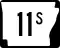 Arkansas state highway spur routes are signed using standard state highway shield backgrounds. The number remains the same size and a "S" (for spur) is added in an almost-exponential format. Shield sizes remain, one-digit routes keep the 24-by-24-inch (61 cm × 61 cm) shields, while two-digit routes become 24-by-36-inch (61 cm × 91 cm). Three-digit routes are the same as the parent route with the "S" placed in the available corner space. The "Spur" banners are usually not used by ArDOT, which instead prefers to use only a direction banner.