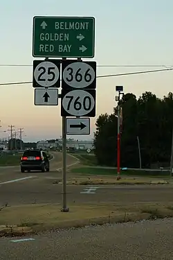 MS 760 begins at an intersection with MS 25 (2nd Street) at the southern edge of Belmont. It heads east through rural farmland before curving to the north to enter Golden and pass northward through an industrial area. The highway passes through neighborhoods along Main Street before entering downtown and curving to the east along Stanphill Street. MS 760 comes to an end shortly thereafter at an intersection with MS 366 (Front Street/Red Bay Road). The entire route of MS 760 is a two-lane highway.[8]