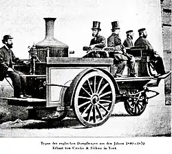| Fowler | England | 1862 | John Fowler built a steam car in 1862.[33] |