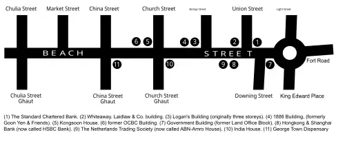 | Beach Street | Lebuh Pantai | Self-describing. The street ran along the shoreline until the construction of Weld Quay. | N. of China St | பீச் வீதி Pīc Vīti |