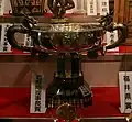 A silver trophy of 1.08 m (3 ft 6+1⁄2 in) tall and weighing 29 kg (64 lb). The chrysanthemum symbol of the Imperial family is carved on the trophy. The kanji for shihai (賜盃), meaning "gifted trophy", a traditional phrasing for a trophy bestowed by the emperor, are carved in the trophy. Its handles are phoenixes and the base of the trophy is filled with engraved plates with the name of the winning wrestlers of the past tournaments. 78 wrestlers can complete one round, once a round is filled the plates are removed and added to boards exhibited near the trophy in the Kokugikan.[8][9] | Japan Sumo Association chairman (rijichō) in the name of the Emperor of Japan | 1926