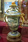 Chinese Embassy Award | Trophy made using colored enamels held in place within partitions formed by metal strips or wires, the process being repeated to fill in the gaps left by shrinkage during firing. This technique is emblematic of the Jingtai era, hence the nickname of the trophy "China-Japan Jingtai Blue Cup". | People's Republic of China | 1980