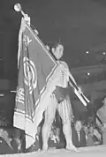 Introduced with the 1909's tournament reform creating the yūshōkishu system. Highest trophy awarded to wrestlers before the introduction of the Emperor's Cup. Held by a flag bearer (usually a high-ranking makuuchi wrestler from the same stable or the same ichimon) during the winner's parade after the tournament. The championship flag is the only trophy awarded in the name of the Association, along the sanshō prizes. |