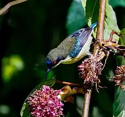 Nectariniidae is a family of passerine birds in the superfamily Passeroidea, comprising the sunbirds and spiderhunters.[1] Members of Nectariniidae are also known as nectariniids.[2] Their range extends from the Afrotropics north to the Levant and southern Arabian Peninsula, and east through South and Southeast Asia up to New Guinea and northern Australia.[3] They inhabit a wide variety of habitats, from arid savannah to tropical rainforests, and can be found from sea level to an altitude of 4,900 m (16,100 ft). Sunbirds are generally small birds with long, thin, down-curved bills and brightly coloured, iridescent plumages.[2] They display marked sexual dimorphism, and males are much more visually striking than females, who are usually dull green, brown, or grey. The spiderhunters (Arachnothera) are larger than other sunbirds and show less sexual dimorphism.[3]