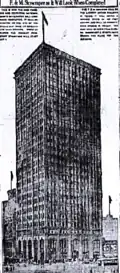 Fort Worth's history of skyscrapers began with the completion of the 7-story Flatiron Building in 1907. When built, it was the tallest building in North Texas.[3] The Flatiron Building stood as Fort Worth's tallest structure until 1910, with the construction of the 10-story Baker Building (since renamed the Bob R. Simpson Building).[4] Fort Worth went through a major growth in skyscrapers during the 1920s and 1930s, with the Farmers and Mechanics National Bank building (since renamed 714 Main) emerging as the tallest in the city.[1] The Farmers and Mechanics building remained the tallest in the city until 1957, when the 30-story Landmark Tower was completed.[5] From the early 1970s to the mid-1980s, Fort Worth went through the largest construction boom in the city's history.[6] In 1983, the 40-floor Burnett Plaza was constructed, surpassing the Landmark Tower. The Burnett Plaza has remained the tallest structure in the city to date.[7]