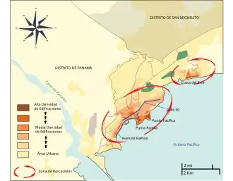 The city's zonification, which was regulated in 2004 by the Ministry of Housing and Land Management of Panama, defines the main districts or sectors of San Francisco, Punta Paitilla, Calle 50, Avenida Balboa, Costa del Este and Punta Pacífica as areas suitable for the construction of tall buildings.[6] Currently, the construction of these types of buildings is regulated by Law 49 of 2004, which repealed Law 78 of 1941, which established that the height would be conditioned by the width of the road where the structure was located. With the new implemented section of law, the building heights is currently defined based on the population density of the land, which in certain areas may be a maximum of 1,500 residents per hectare.[7] In the recent years, a multimillion-dollar regulatory plan was commissioned for the city of Panama. One of its recommendations is to increase the density of the city, that is, the number of population per unit area, forcing more intensive use through increasingly taller buildings.[8]
