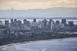 Rio de Janeiro is the capital and largest city of the state of the same name, and the second largest city in Brazil, with an estimated population of 6,729,894[1] as of 2024. Its metropolitan area is also the second largest in Brazil and the third largest in South America, with a population of 12,022,050.[2] Rio de Janeiro has a relatively short skyline for a city of its size; nevertheless, it is the largest skyline in its state.