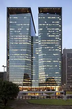 Since the 1990s, few high-rises above 100 m have been built in Rio de Janeiro. The only office building built in Centro above that height in the 1990s was the Manhattan Tower. The 2000s also saw only one new building above 100 m, Torre Almirante. It was built on the site of the former Andorinha Building, which was destroyed by a fire in 1986.[8] The new high-rise incorporates the facade of the destroyed building. The Ventura Corporate Towers were completed in 2010, becoming the city's second tallest building.[9] Designed by Kohn Pedersen Fox associates, the building among the most significant high-rise projects completed in Rio de Janeiro in the 21st century.