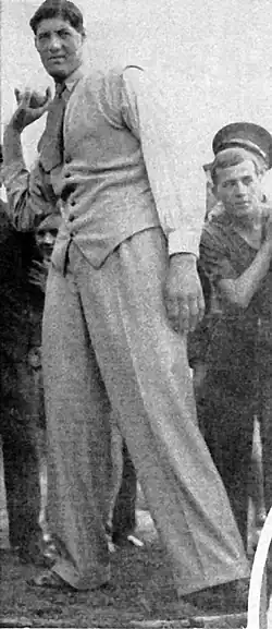 | Max Palmer | United States | 231 cm | 7 ft 7 in | Actor and pro wrestler. Listed by Guinness World Records at 7 ft 7 in (231 cm), claimed 8 ft 1 in (246 cm).[97] | 1927–1984 (57) |