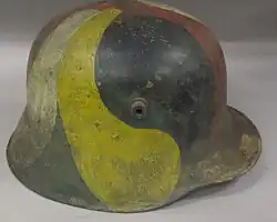 The term "Hun" from this speech was later used for the Germans by British and other Allied propaganda during the war. The comparison was helped by the spiked Pickelhaube helmet worn by German forces until 1916, which would be reminiscent of images depicting ancient warrior helmets (not necessarily that of actual historical Huns). This usage, emphasising the idea that the Germans were barbarians, was reinforced by the propaganda utilised throughout the war. The French songwriter Théodore Botrel described the Kaiser as "an Attila, without remorse", launching "cannibal hordes".[6] By coincidence, Gott mit uns ("God is with us"), a motto first used in the Kingdom of Prussia and later the German Empire, may have contributed to the popularisation of 'Huns' as British Army slang for Germans by misreading 'uns' for 'Huns'.[7]