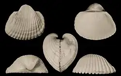 Shell in multiple views of an Anadara brasiliana, or incongruous ark clam - †Anadara callicestosa