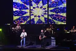 Moraz was not replaced in the band's official lineup.[12] Starting with the 1991 tour, Boshell took over as lead keyboardist, Paul Bliss was brought in as backup, and Susan Shattock and June Boyce took over on backing vocals.[13] In 1993, Tracy Graham replaced Boyce.[9] The group's touring lineup remained constant until April 2001, which marked the final appearances of Boshell and Graham. The pair were replaced by keyboardist and backing vocalist Bernie Barlow.[9] In December 2002, Ray Thomas announced that he would be retiring from performing, reducing the band's official lineup to the trio of Hayward, Lodge and Edge.[14]