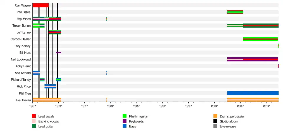 The Move evolved from several mid-1960s Birmingham based groups, including Carl Wayne & the Vikings, the Nightriders and the Mayfair Set. Their name referred to the move various members of these bands made to form the group.[2] Besides Wood, the Move's original five-piece roster in 1965 was drummer Bev Bevan, bassist Kefford, vocalist Carl Wayne and guitarist Trevor Burton.[2] The final line-up of 1972 was the trio of Wood, Bevan and Jeff Lynne; together, they rode the group's transition into the Electric Light Orchestra. Between 2007 and 2014, Burton and Bevan performed intermittently as "The Move featuring Bev Bevan and Trevor Burton."