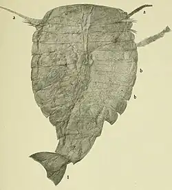 Restoration showing the top (left) and underside of the Late Ordovician trilobite Triarthrus - †Triarthrus becki