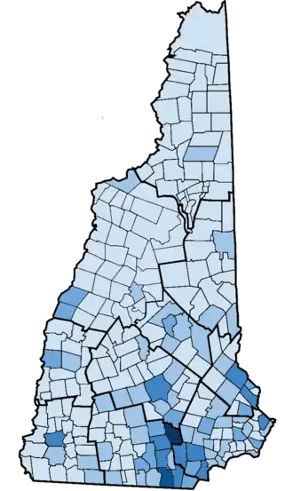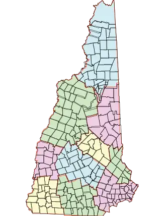 New Hampshire is a state located in the Northeastern United States. It is divided into 234 municipalities, including 221 towns and 13 cities. New Hampshire is organized along the New England town model, where the state is nearly completely incorporated and divided into towns, 13 of which are designated as "cities". For each town/city, the table lists the county to which it belongs, its date of incorporation, its population according to the 2020 census, its form of government, and its principal villages. Cities are indicated in boldface. Cities and towns are treated identically under state law.